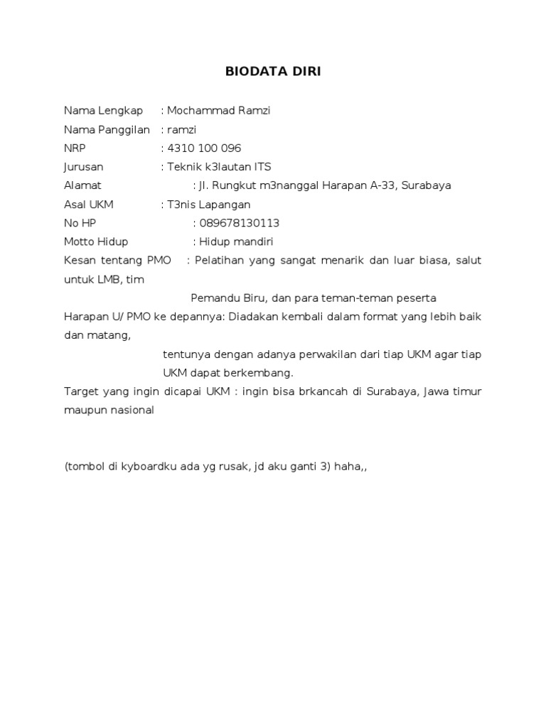 Contoh Biodata Diri Yang Menarik : Contoh Daftar Riwayat Hidup Tulis Tangan Yang Baik Dan Benar : Mencari kerjaan pada jaman saat ini memang tidak mudah, biasanya dengan kelengkapan anda mengisi biodata diri dengan menampilkan keunggulan yang anda punya akan menjadi prioritas perusahaan untuk menerima anda.. Merupakan tulisan yang membahas atau menceritakan kehidupan seseorang, menulis sebuah biorafi juga memiliki berbagai tujuan sesuai dengan kebutuhan sang penulis. Pada cv terdapat identitas diri, riwayat pendidikan, karier, dan informasi lainnya. Jati diri yang diperlihatkan ini memiliki sifat umum hingga tidak memunculkan permasalahan dijumpai oleh beberapa orang. Teks biografi ditulis oleh orang lain. Cv biasa digunakan untuk melamar pekerjaan, meneruskan studi, atau keperluan yang membutuhkan identitas.